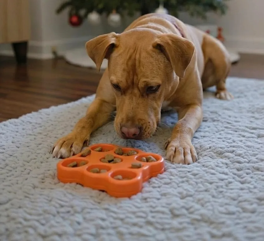 - Use enrichment as a calming outlet: Lick mats, puzzle feeders, and scent games encourage soothing, self directed behavior.